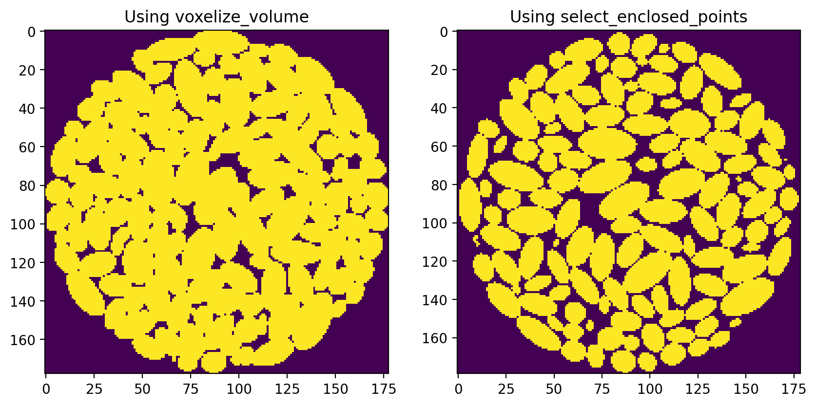 In any event, the select_enclosed_points method seems preferable since the particles are much better defined. It is possible to dilate the particles to get something similar to the voxelize_volume result, while eroding the particles from voxelize_volume will not give the clear separation of the select_enclosed_points method.