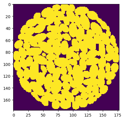 The final step is converting this vox mesh object into a Numpy array. The voxelization process not only generates a cubic mesh, but it also determine which voxel represents solid or not. This information is stored on the vox dictionary object under the key 'InsideMesh', as a vector containing 1 for voxels inside the ellipsoids, and 0 outside. Converting this vector into a cubic image was the last hurdle. I needed to reshape it from a linear vector into 3D array, but first I needed to determine what shape to use.