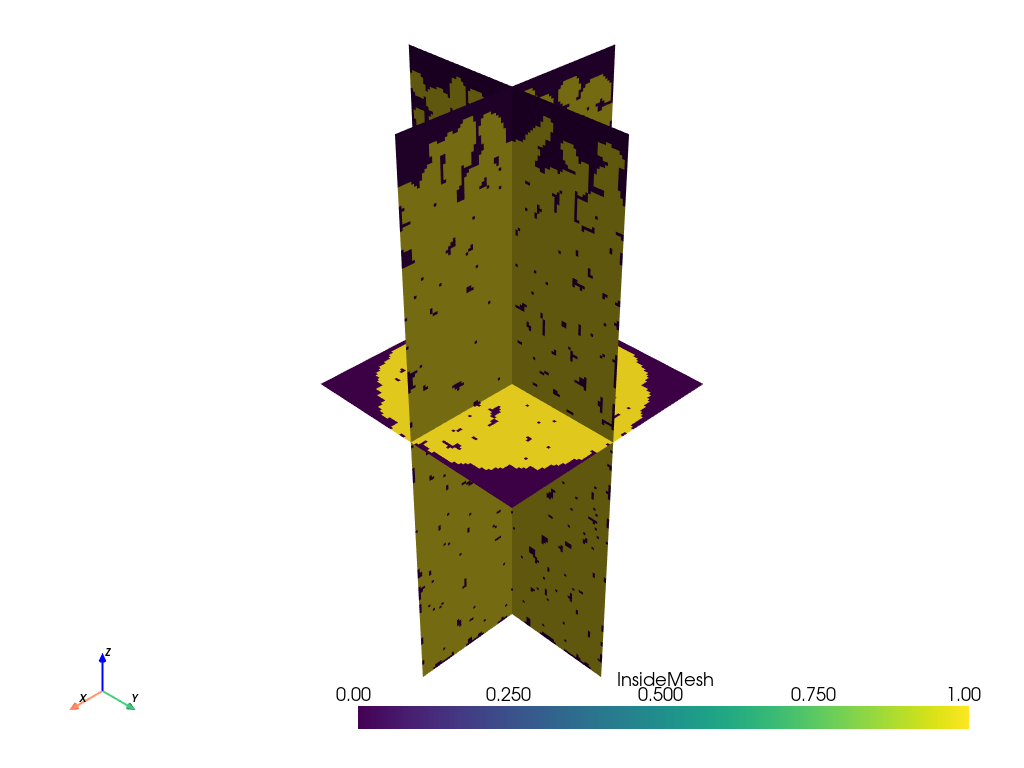 slices.plot(scalars='InsideMesh')Which yields the following, where the voxelized nature of the surfaces can seen: